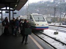 Nach erholsamer Nacht im Hotel gleich gegenüber vom Bahnhof Brig gehts mit dem CIS um 9.00 Uhr nach Mailand. Der Zug kommt pünktlich, keine Spur mehr vom Streik der italienischen Eisenbahnen vom Vortag. Dennoch +5 in der Abfahrt des CIS, welcher pünktlich gewesen wäre, wenn nicht eine Gruppe von snowboard- und skibepackten jüngeren Damen erst beim Halt in Brig bemerkt hätte, dass sie eigentlich jetzt aussteigen sollten. Vorher war aber noch alles Gepäck zusammenzupacken und dazu der nicht eben opulent breite Zugang des CIS-Endwagens komplett zu blockieren, welcher nur an einer Seite Ausstiege hat. Als Folge davon kommen erst mal ungefähr 20 Leute nicht raus und wir nicht rein. Bis sich das ganze Knäuel entwirrt hat, sind +5 im Plan. Ein hervorragendes DAB-Beispiel, wie wir finden.