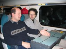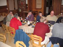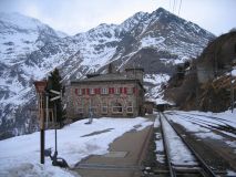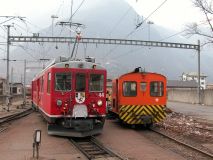 Der 58minütige Übergang in Tirano sollte zum Einkauf genutzt werde, aber die italienischen Ladenöffnungszeiten sehen das am Sonnabend nachmittag nicht vor. So sind einige im Ristorante bei Lasagne, Spaghetti und Gelato al Limone, andere frühzeitig am Bahnsteig. Die EU-Außengrenze wird unter dem gestrengen Blick eines korrekt uniformierten italienischen Zöllners problemlos von allen Teilnehmern passiert. Am Bahnsteig regen einige schweizer Weichenlaternen zur Diskussion an, und bei Ankunft des Regionalzuges aus St. Moritz erleben wir vor dem Einsteigen eine schöne Rangier-Aktion, die sogleich (analog zur "Pumpen-Gymnastik" vor dem Hochfahren einer Kraftwerksturbine, wie wir das am Vortag gelernt hatten) als "Triebwagen-Gymnastik" zu klassifizieren ist. Das Publikum auf dem Bahnsteig zu Tirano ist gemischtes Volk, neben zwei deutschsprachigen Pufferküssern und modisch gekleideten Italienern ("praktische" Gucci-Schuhe im Army-Look an der mürrischen Maid) lungern auf den Bänken US-Amerikaner herum (not-native american white trash), welche mit ihren Übergrössen an Schneeschuhen und breitem Dialekt (it's soooo nice) den Bahnsteig in Beschlag nehmen. Unsere Garnitur besteht dann aus den ABe 4/4 II 43 und 44, dem B 2308 mit reservierten Plätzen und dem BD 2475. Allerdings haben andere bereits unseren reservierten Wagen occupiert, so dass wir in den ersten Triebwagen einsteigen. Die Pünktlichkeit der RhB auf der Berninalinie ist nicht ganz so ausgeprägt wie die anderer schweizer Bahnen, aber die Ankunft auf Alp Grüm ist trotz verspäteter Abfahrt pünktlich und so genießen wir eine schöne Bergfahrt im letzten Tageslicht. Das Quartier auf Alp Grüm (Massenlager) empfängt uns in alt bekannter Gemütlichkeit und in diesem Augenblick findet das debx2005-Treffen in der Bahnhofsgaststätte Alp Grüm statt. Anwesend sind: Tobias Köhler, Klaus von der Heyde, Hans-Jürgen Ramoschat, Jürgen Schubert, Matthias Dingeldein, Klaus Peukert, Rainer Burre, Carsten Weber, Uli Maschek, Ralf Gunkel, Marc Haber, Wolfgang Auer und Reinhard Greulich. Michael Rudolf muss uns leider breits mit dem Zug um 19:07 verlassen und hofft inständig, morgen früh rechtzeitig zu seinem Frühdienst wieder den SBB zur Verfügung zu stehen. Aber hat da jemand überhaupt Zweifel, bei dem was wir in den letzten zwei Tagen erlebt haben? ;-)
