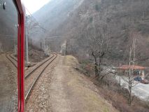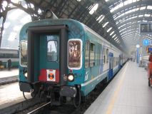 Der Diretto nachTirano fährt pünktlich 12.15 Uhr ab, reservierte Plätze im Steuerwagen sind wider Erwarten sogar ausgeschildert, was auch angesichts des Füllungsgrades des Zuges durchaus willkommen ist. Einblicke in das feingesponnene Geflecht sozialer Beziehungen der italienischen Bahner bietet das Vorpreschen in den vorderen Bereich des Steuerwagens (z.T. sechs Leute im kombinierten Gepäck-, Fahrrad- und Dienstabteil), welche lautstark gestikulierend Lebenslust repräsentieren. Der Diretto besteht aus einem Niederflur-Steuerwagen, einem zur Hälfte deklassierten MDVE 1. Klasse, sechs MDVC (davon einer 1./2. Kl. deklassiert) und der schiebenden E646.154.